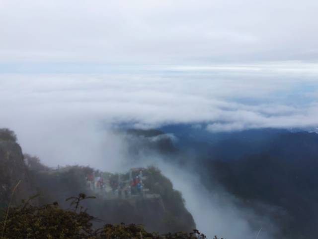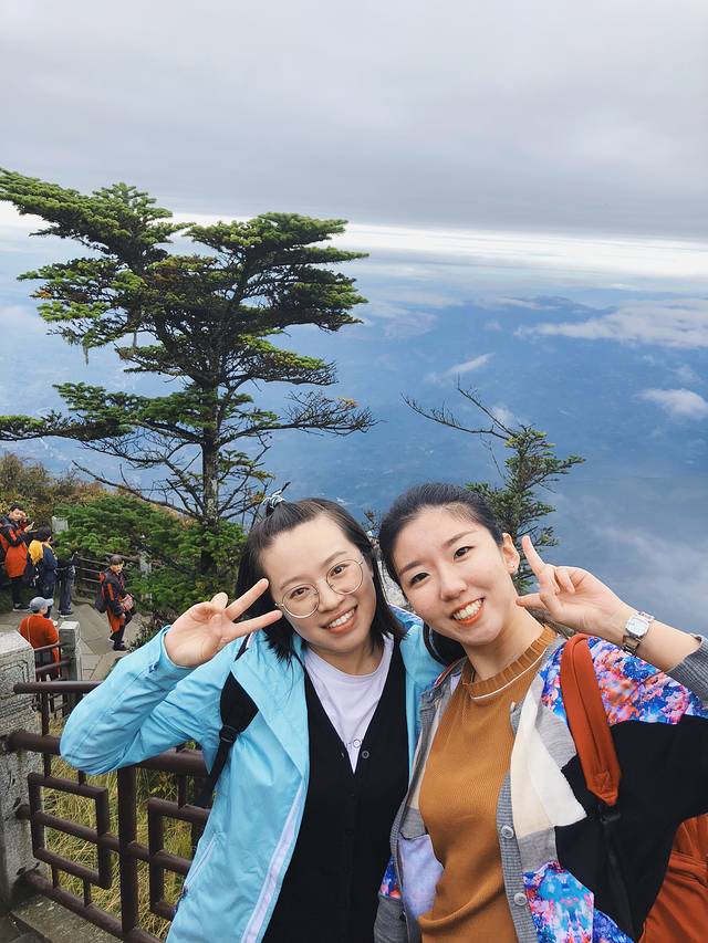 爬山的时候一定不要低头爬,歇口气的时候一定一定要回头看看脚下的风景,在不经意间,你就已经置身云海,宛如仙境了。就在我和晓楠再而衰的时候,登顶归来的人们一直给我俩打气,还有的人告诉我们不要继续爬了,山顶上的能见度太低已经看不到金顶了。但是我和晓楠始终不肯放弃,就算是看不到我们也要冲上去啊!怎成想我们如此幸运,在我们登顶成功的时候,金顶就清晰的屹立在我们面前。在云海之上,佛光普照的感觉,云聚云散,妙不可言。