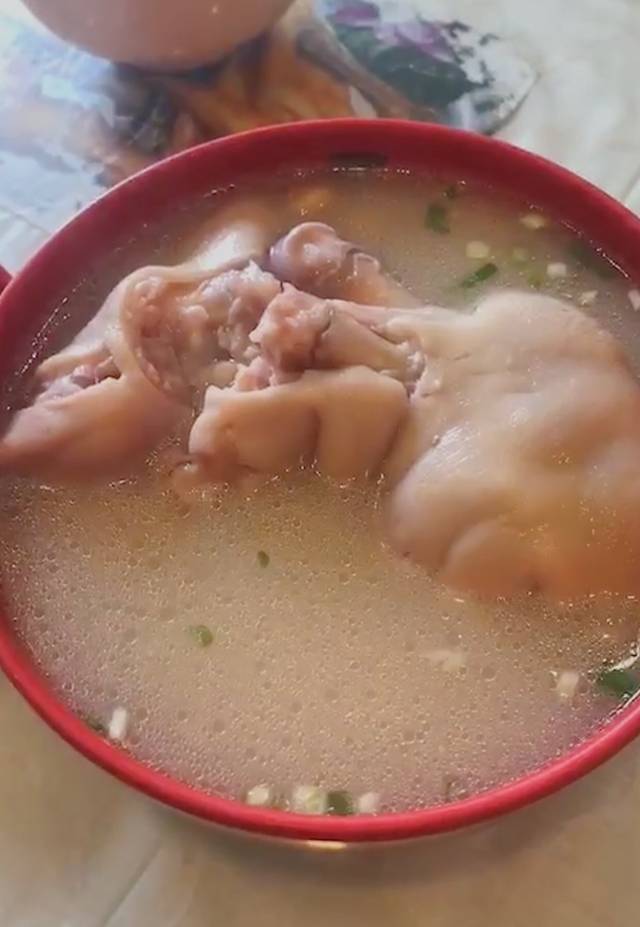 蹄花很大一只,奶白的汤底每一口都很香浓,撒上些许葱花,丝毫没有猪蹄本身的腥臭味。蹄花熬煮到火候,每一口都抿的出胶原蛋白的丰富,骨头自不必说,轻轻一嗦就脱下来。蚕豆也是煮的绵密,和蹄花的口感相得益彰。如果吃到半程觉得腻口,一定要配上红油调料,红油的香辣瞬间消灭了油脂作祟,胃口大开,还可以继续大快朵颐了。