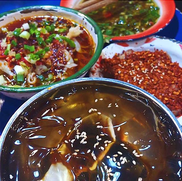 红油和家乡的红油不太一样,不会太辣,倒是油香油香的。藤椒的倒是辣一些,藤椒的鲜味很好的沁润着串串,让人停不下来。冰粉也是灵魂一击,此时此刻又想吃冰粉了。