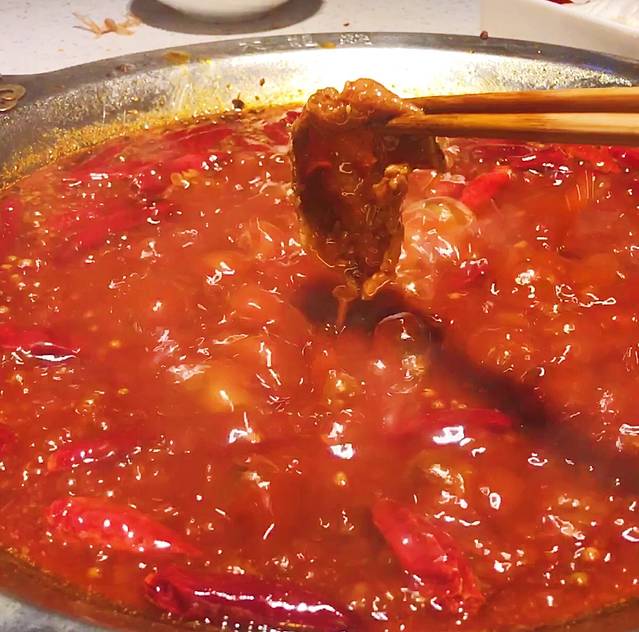 比起小龙坎,大龙燚要热烈一些,如果坐在空调的下风口,你会觉得有点微微呛,但锅底味道很扎实,浓郁又刺激。