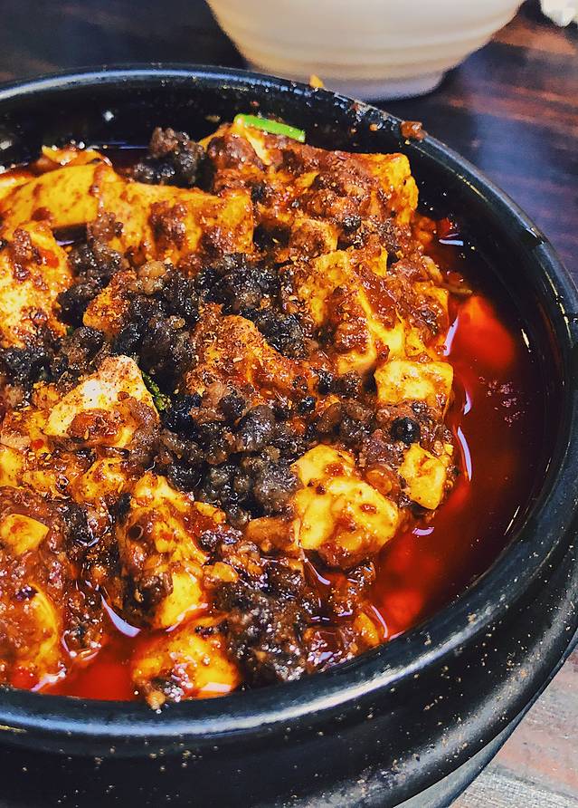 今天的重头戏!终于在我们快要吃饱的时候上桌了。没有小当家的魔幻金光特效是自然,但是口味我真的要暴风哭泣了。先说用料,很实在的用豆豉炒过的大块牛肉粒,实现了麻婆豆腐的牛肉粒自由。再说口味,不知道为什么,我总觉得肉粒有糊味,完全不香。豆腐虽是石锅上桌但完全不是印象中的又烫又麻又辣。我理解的麻婆豆腐第一点就应该是烫,是那种可以让海椒和麻辣在舌尖上尽情舞蹈的热度,我们仨人一人一勺豆腐之后基本就结束了麻婆豆腐的探味旅程,我不甘心又反复尝试,终究没能成功唤醒我的期待。