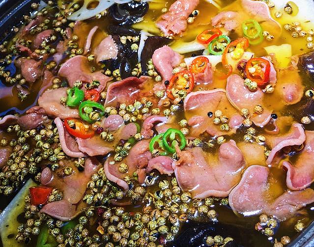 火锅初体验,鳝鱼之前更多是在毛血旺里吃过,火锅版的鳝鱼吸收了锅底浓郁的汤汁,再让鳝鱼在油碟里油一圈送入口中,成都最后一个夜晚诚是不赖了。