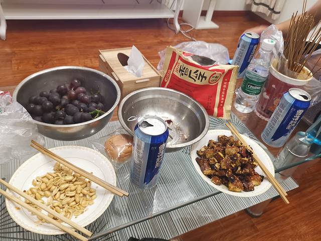 酒足饭饱,开始沿着成都街头流浪,然后开始了买夜宵之路,买了乐山钵钵鸡,花生米,不能忘买点水果补充营养。