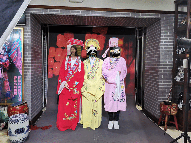 还可以免费穿戏服拍照,三个男生穿,很有喜感。