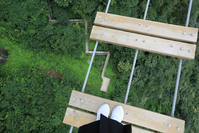 一路就到了情人桥,可以拍拍照,桥还是很温柔,基本都能过的,实在不敢走的,旁边有山路,就2-3分钟的事。情人桥那里还可以玩超级大秋千,我看到有一对情侣在荡秋千,突然想到一首歌(我和你荡秋千,荡到了天外天.......),我反正是没有勇气去尝试的,还有云中漫步,这个倒不怎么吓人,可以接受,不过如果中途踩空,估计也会吓尿~~~