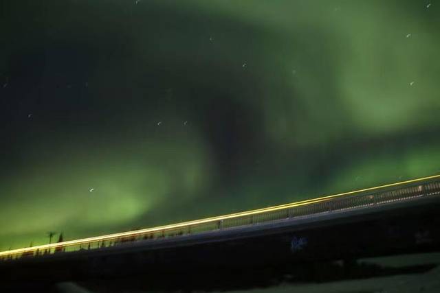 第二天晚上,我们一大批人浩浩荡荡的跟着小哥,叨着家常,走了不少地方才看到极光,就在大家都沉浸其中的时候,小哥在一旁看着,像是松了一口气。边狠狠咬着套餐里准备的烤鱼,我边内心吐槽着这个誉有“地球上极光出现频率最高”的地方,竟然让我宝贵的腿走了这么长时间。吐槽归吐槽,其实我们的“极光猎人”还是很专业的,愣是带着我们走出了一种“刺激”又“惊心动魄”的感觉,让我们惊喜连连,当然,如果忽略掉第一天的空手而归,其实还是不错的。