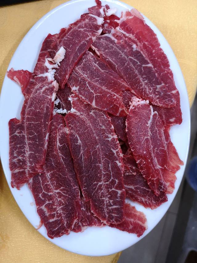 雪花牛肉,吊龙价格大概是7-80吧,从牛肉的样子来看,并不像手切的,应该是冷冻后机器切的(小小失望)