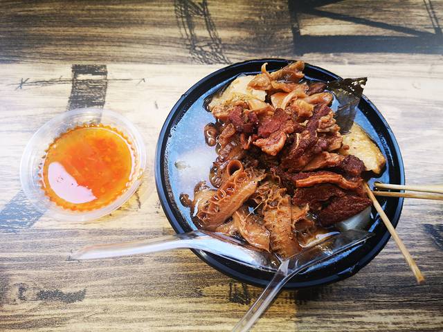 这个这个,看到这个又走不动道了,来之前就心心念念的牛杂萝卜,在福建一直没吃到像样的牛杂萝卜,在潮州看到了,这怎么能放过呢??问一下价格,最低配置30元(含牛腩,牛筋,金钱肚)加牛肉丸就40,emmmm第一感觉有点小贵,但是我实在不想错过这个