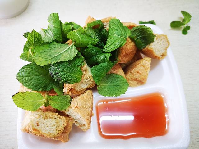 炸豆腐据阿姨说,先拿起签字扎上薄荷叶,再扎豆腐,接着蘸蘸边上红色的辣椒醋