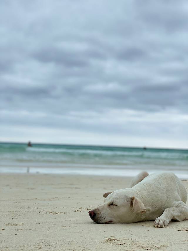 在沙滩边看到了一只正在享受着海风吹来睡觉的狗🐶