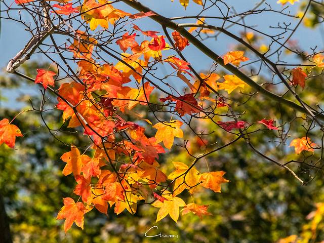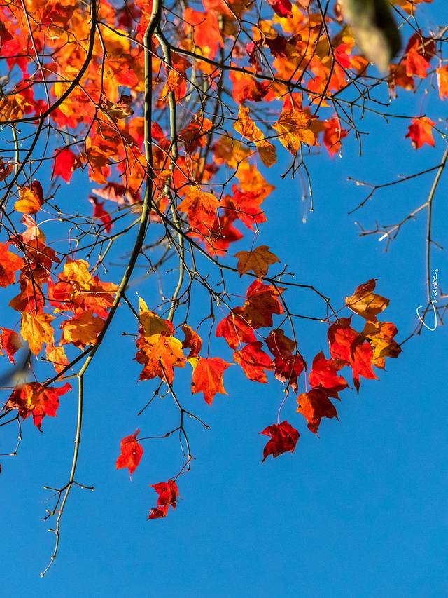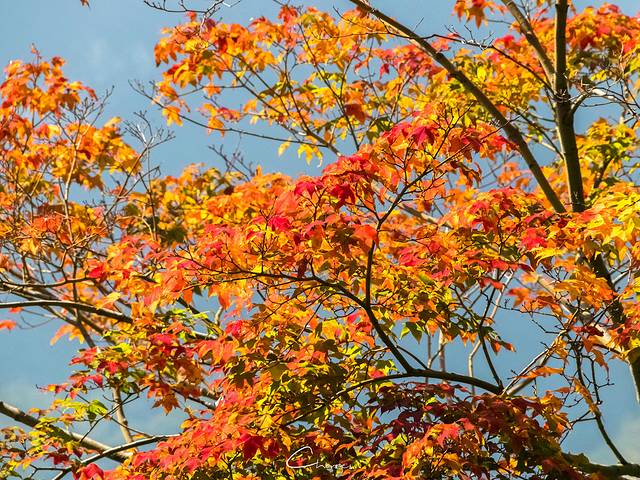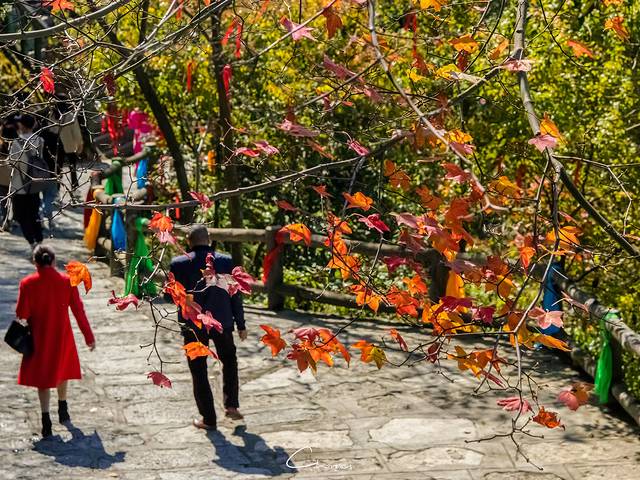 沿着儿玛古道,在进入玻璃栈道之前,我们看到了枫叶。这个时候的秋意已经很浓了,由于前些日子下雨大风,许许多多的枫叶已经被吹飞了,在我们来的这一刻算是仅存的一些,但是依然可以感受到秋意。