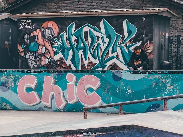 从春熙路一直往北走,路过大慈寺国际青年社区。这里就像是一个迷你版的涂鸦公园,是专门给滑板爱好者们建造的一方小世界。