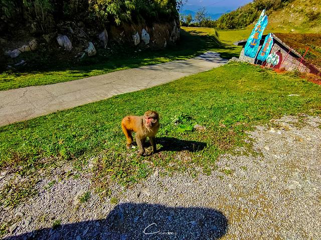 下了车之后,就发现了一群猕猴。他们不停地打量着我们,后来才知道是在看我们是否带了吃的。而就在我们一个同伴拿出面包的那一刻,这一只调皮的猴子猛地冲过来抢走了一整包的面包,随后消失在丛林里面。