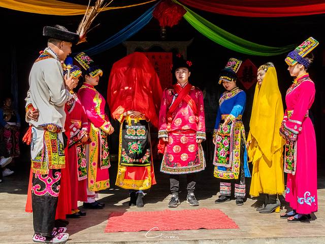 为了让游客更加充分的感受不一样的礼仪,司仪在现场邀请了一对男女作为今天婚礼的新郎与新娘,同时也邀请了一些游客作为轿夫和伴娘,就当做是情景剧一般在展示羌族婚礼的一个过程,这个可以成为mini版本的婚礼仪式。