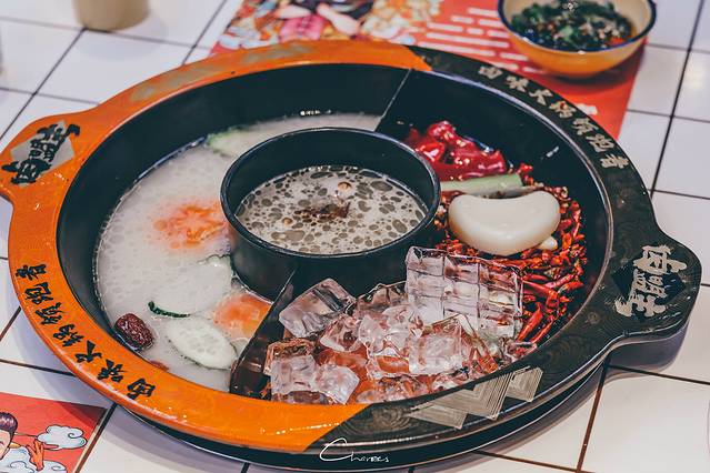 为什么加冰,服务员说它家锅底是由牛油低温炒制,加入适合低温慢煮的血旺,豆制品等菜品。所以由冰块替代传统的汤,作用是中和锅底温度,让锅底油脂缓慢融化,将牛油的营养,油脂香味最大的保留。