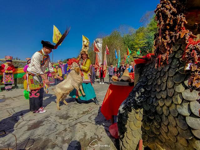 接着祭司会诵经祈福,焚香祈祷,带领当地的羌 民和 参加的游客一起完成这个仪式。随后在现场宰杀羊,作为祭祀品。随后羊血会被祭司诵经,用来消除厄运。
