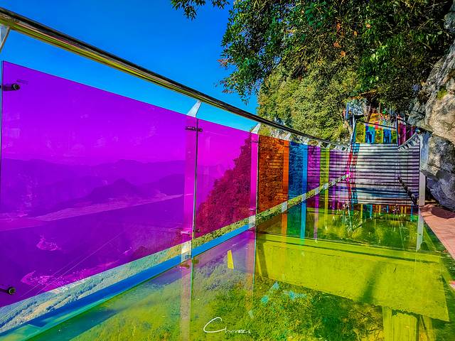 在玻璃栈道的拍照点到出口有一段是五颜六色的设计,这一段看起来非常的酷炫,尤其是在眼光的照射下,显得更加有动感和色彩,这也是第一次看到玻璃栈道有这样的设计,充满了活力与动感。