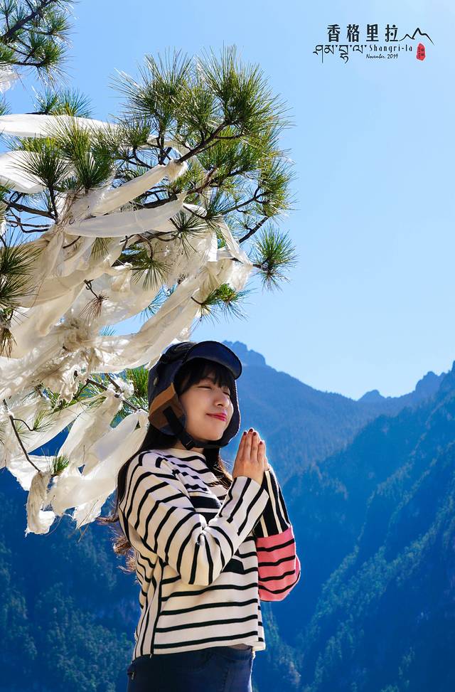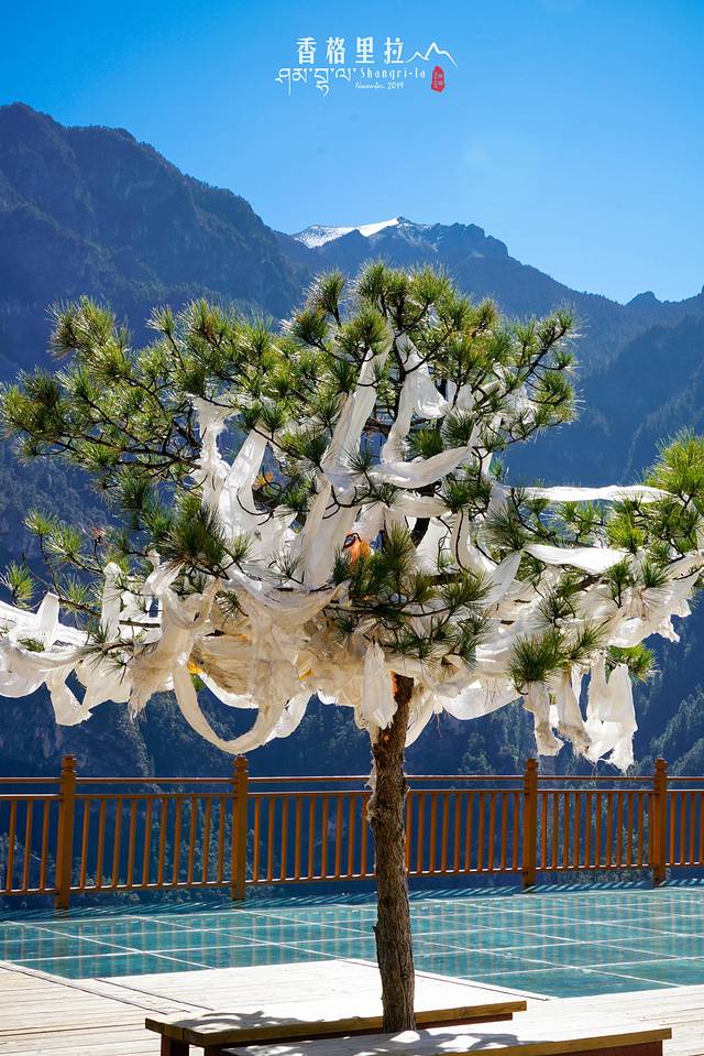 玻璃栈道观景台上还有一个被哈达缠绕的松柏,人们把吉祥如意留在了海拔3000米的雪域高原中。旁边可以租赁藏族服饰哦。