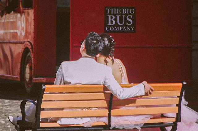 欧洲风情小镇上,恋人相拥