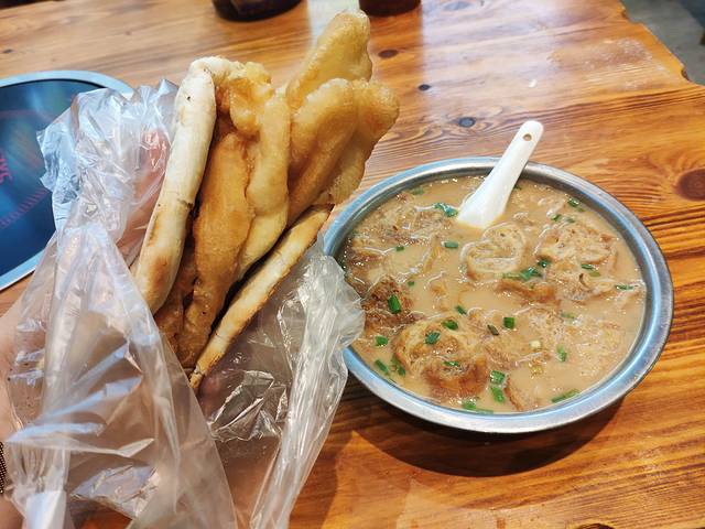来之前一直心心念念着杭州的咸豆浆,因为之前并没有试过咸豆浆,并不知道这个滋味是怎么诱惑了那么久的杭州人民。不过我个人尝了咸豆浆后,感觉并不太能接受这个味道,最后弱弱地又叫了杯甜豆浆😂😂烧饼夹油条味道还是蛮不错的~