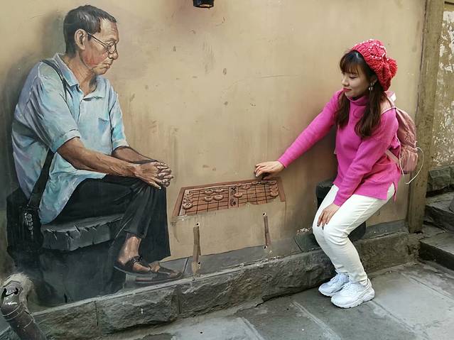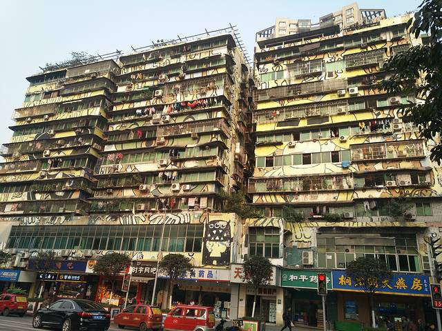 从解放碑打车过去半小时车程,费用30多,石井坡地铁口对面,看到一栋黄色的房子走过去就到了,然后顺着楼梯下去,会发现另一个世界。。。里面的打卡点都有地图指引,但是是居民住楼,所以我们不敢太靠近,就在楼外摆拍了一下,也可以可以玩个一两小时的点了