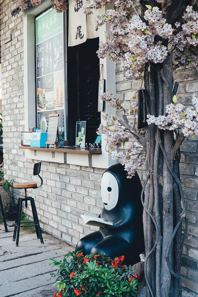 千与千寻里的无脸男在店铺的樱花树门口守候着。