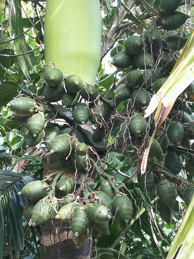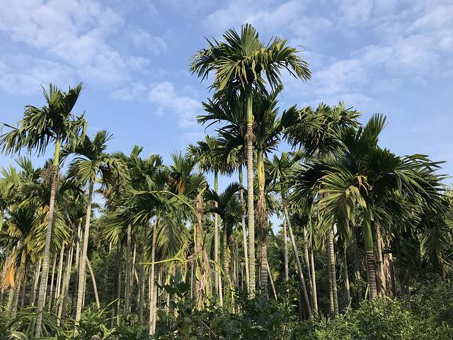 槟榔,学名:Areca catechu L.,单子叶植物纲、初生目、棕榈科、槟榔属常绿乔木,花果期3-4月