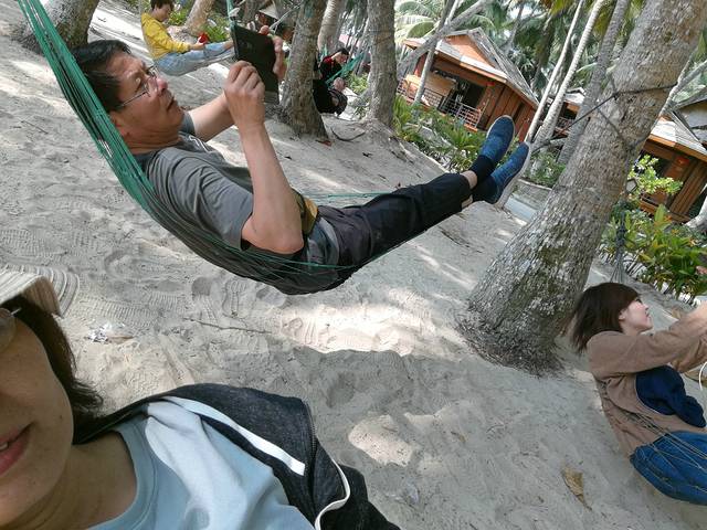 一溜小跑,进入林荫,爬上吊床,再也不想下来,一个多小时很快就过去了。头枕椰风,双目微闭,摇一摇,进入了睡眠前的妙不可言,瞬间一切都模糊了,高兴的伤心的,都没有了。。。