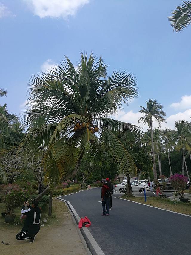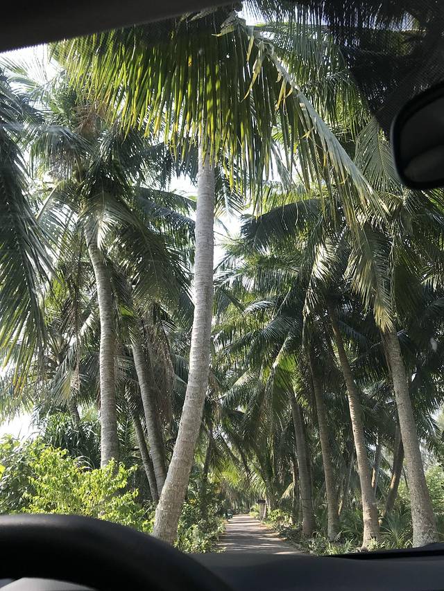 两边是密密的椰林,而且只能一辆车过去,而且曲曲弯弯,两边的椰子树还经常斜着探身到路上,一路小心翼翼躲避着,又唯恐对面有车过来,大约这样走了20-30分钟,几百米,上了省道才知道这是绿道516, 17,供游人步行的绿道。
