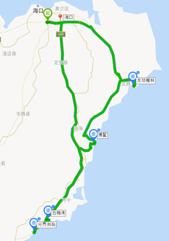 Day 2,分界洲岛,住博鳌(688)。全程100km。午饭204,晚饭128,门票366+120
