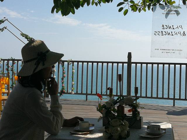 海边的茶座,人不多。更吸引我的是旁边的白色长条桌椅,想到了在双廊排队等着拍照的情景