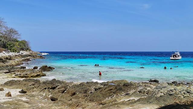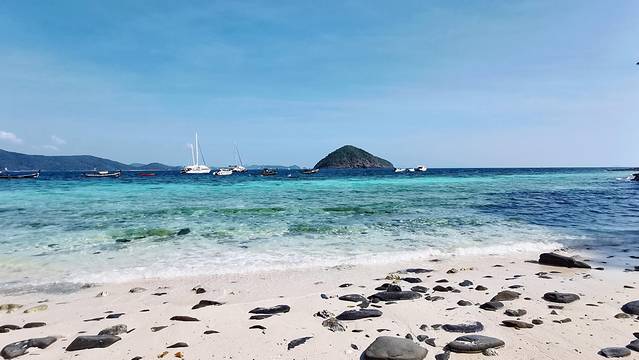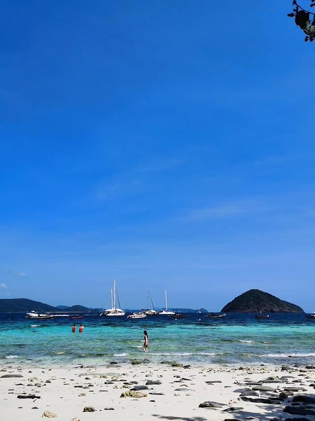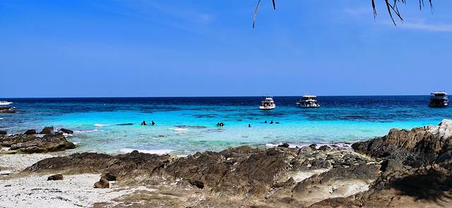 皇帝岛的登岛点和深潜点分别在岛的两边。我一登岛就被拉去深潜了,所以不知道不深潜的朋友们在做什么。但是据没有深潜的阿玲说,她勉强找了一个阴凉处坐着看了一个多小时的海,不过登岛点的海滩真的有很多很多人,虽然海依旧很美,但是比较影响观海体验。