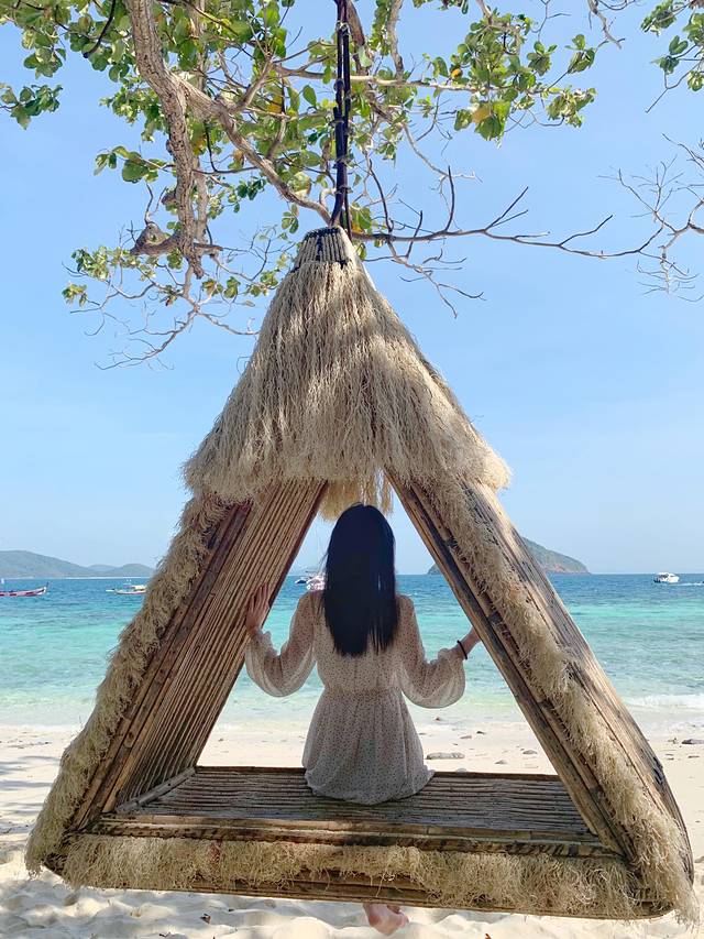 关于这个网红秋千我一定要吐槽两句。首先是秋千其实是有点小,个子高的人坐进去就很挤了(当然我没有这个烦恼)。然后有个很坑爹的地方就是秋千总是会自己转,没有办法正对着海面,坐在秋千里的人自己是没有办法使劲的,需要有人在旁边帮忙调整方位。但如果是拍的人放好位置,再退回去拍,还没做好准备秋千就转过去了。所以最好是三个人配合,一个人拍,一个人转,一个人摆姿势。最后,沙滩上就两个秋千,但是有好多好多人要排队拍照,还好我是我们那一批里最早发现这两个秋千的人,在大家还在海滩边打闹、和导游确认行程的时候拉着阿玲过去悠哉地拍满了份额,然后笑看他们排队拍照。