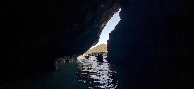 船长会根据当天洞穴的涨潮退潮情况调整具体的行程。我们去了蝙蝠洞。刚进去还没什么感觉,但是船长用探照灯一照,洞顶上密密麻麻都是蝙蝠,瞬间一身鸡皮疙瘩,赶紧让船长别照了,生怕惊动了它们。