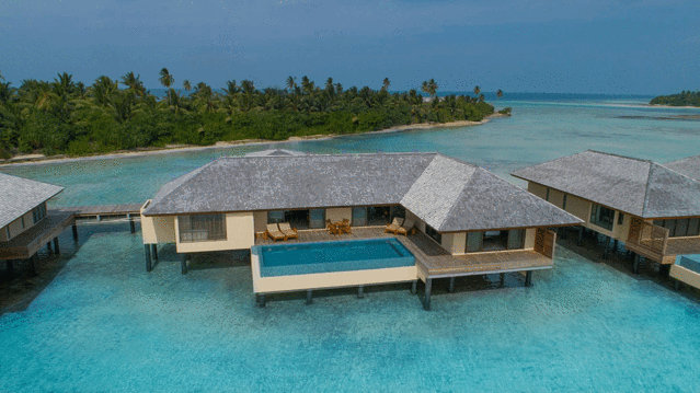 顺着沙屋前的栈道一直走到尽头,就是双卧沙滩别墅。不知不觉小爱已经跟着小黑走到岛屿最南部,光看位置就很不错,附近只有Spa中心、拖尾沙滩和健身房,私密性非常好。