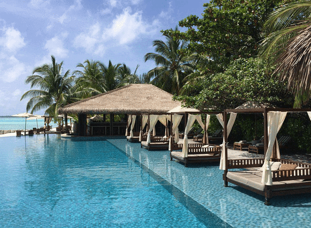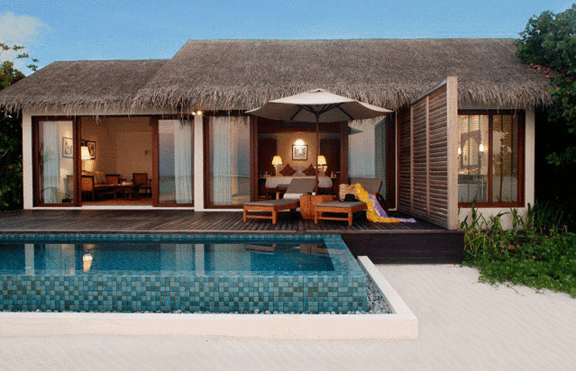 沿着栈桥往回走到小岛东边,是一整排沙滩别墅,普通沙屋和泳池沙屋交错排列。两者的陈设、空间设计都差不多,不同之处在于泳池沙的卧室后开了一扇落地窗,可以直接步行到另一块甲板,也是游泳池和凉亭的地方,泳池再往外就是沙滩啦!