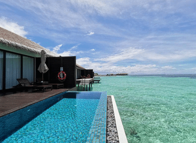 沿着栈桥一直走到尽头就是豪华水上别墅,小爱感觉布局、设计都和水上泳池别墅,估计贵就贵在私密性和景观好吧,毕竟就它一间朝着外海,正对日出还可以欣赏无敌海景!面积比泳池水屋稍大,占地面积182平方米,室内面积100平方米。