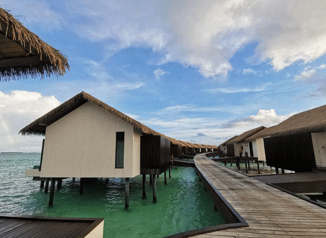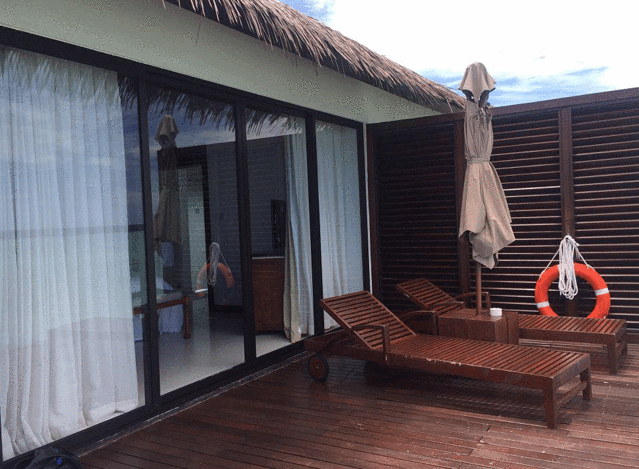 我觉得这里的地段不错,附近就是主餐厅、酒廊、沙滩酒吧、水上运动中心、潜水中心,吃的玩的很齐全。但是缺点是私密性不够,两边分别是基础水屋和沙滩,而且离拖尾沙滩好远~要从北往南穿越整个岛。后来我才知道,原来还有两间同样的水屋在岛屿最南边!这个就看取舍了,具体房号和对比大家可以私聊问我。