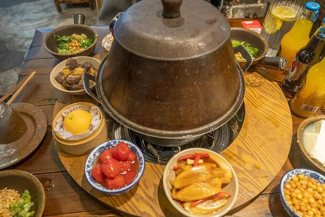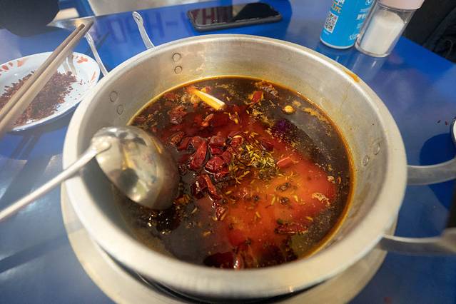 和火锅、泥锅不同,马路边边的这口锅,就是咱们小时候做饭洗碗用的锑锅,并且没有 鸳!鸯!锅!