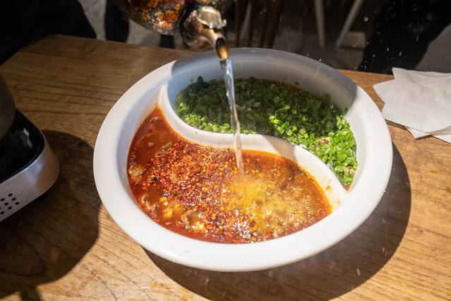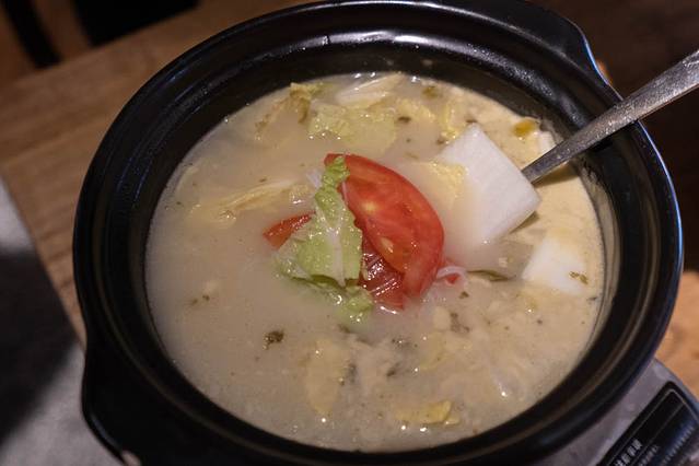 这里的每一锅鱼火锅都是当面制作而成的,把现切好的鱼片铺在300℃高温的鹅卵石上,然后倒入滚烫的火锅底汤烫熟食用。那噗呲呲的声音简直直击食欲。