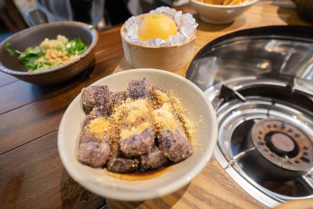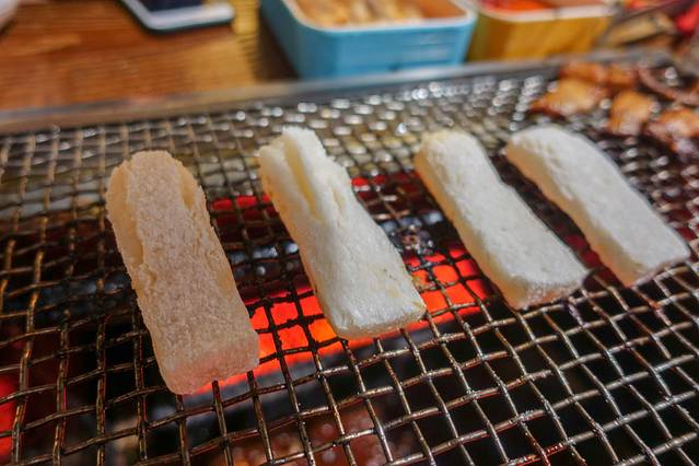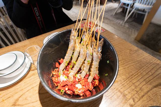 店里有四种蘸料:梅子酱、干料碟、海鲜汁、黄豆酱,可佐以不同的烤串,风味更佳。