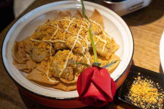 玫瑰蒜香藕盒,一份藕盒加一朵玫瑰,将玫瑰放入装有液氮的瓶里,瞬间冷冻,取出来还冒着仙气儿,再用手拍打成玫瑰碎洒落在藕盒上,一起成就了一道极具造型的菜。