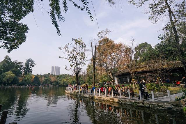 城市的快节奏在这里几乎感受不到,踢毽子、打太极、下棋打牌的老人,跑步锻炼的人,散步玩耍的家庭、情侣,还有很多卖糖画、在地上蘸水写毛笔字、卖画的“艺人”......如果有时间,还真想在这儿待上一天慢慢体味老成都的“悠闲”。