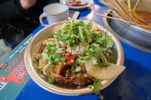 小土豆软软糯糯又入味,“巴适”一词在四川即舒适、满足的意思,由此可见这碗土豆冒菜的地位之高。再点上一份红糖糍粑,甜甜的红糖浆结合外酥里糯的糍粑,解辣又饱肚,涮串最佳伴侣。