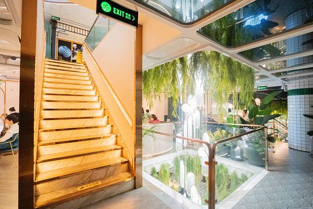 暖黄色的灯光倾泻在墙面、桌椅、楼道上,既营造了一种温馨的感觉,也给食物增添了几分可爱。