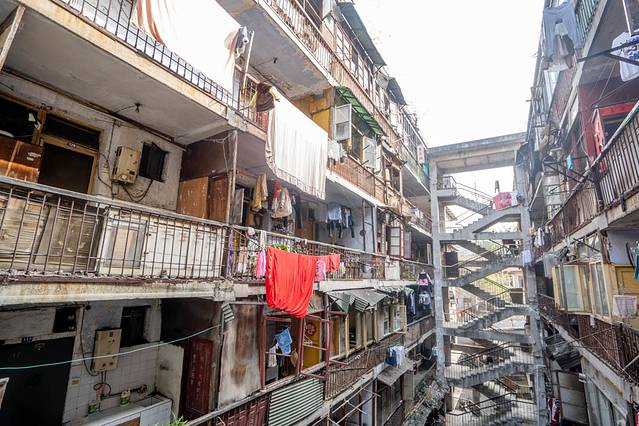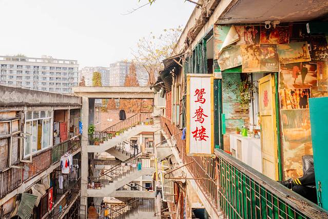 老旧斑驳的外墙,锈迹斑斑的栏杆,窄小陈旧的楼梯过道,摆放在楼道的生活杂物,墙面上张贴的旧时海报,以及外挂的铁丝晾衣架上挂满的晾晒的衣物……都让这栋“鸳鸯楼”极具年代感。