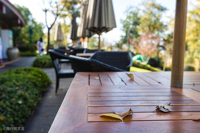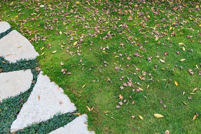 体验完温泉之后,我静静的踏上了一条石板路,走进了一个十分安静,环境优美区域。绿油油的草坪上,掉落的小花洒满了一地,黄红相间,甚是好看。周围的建筑也别具一格,纹路深深的镌刻在房屋之上,颇有一番风味。