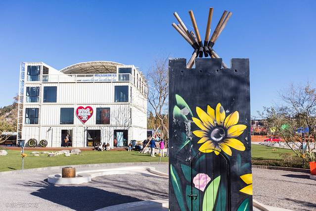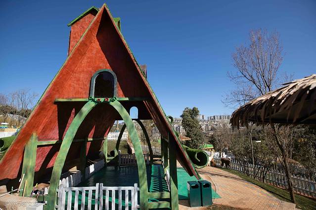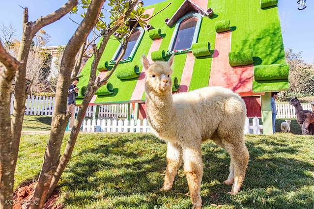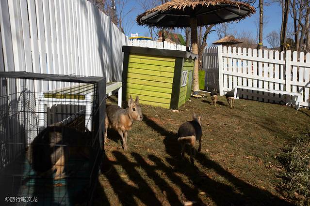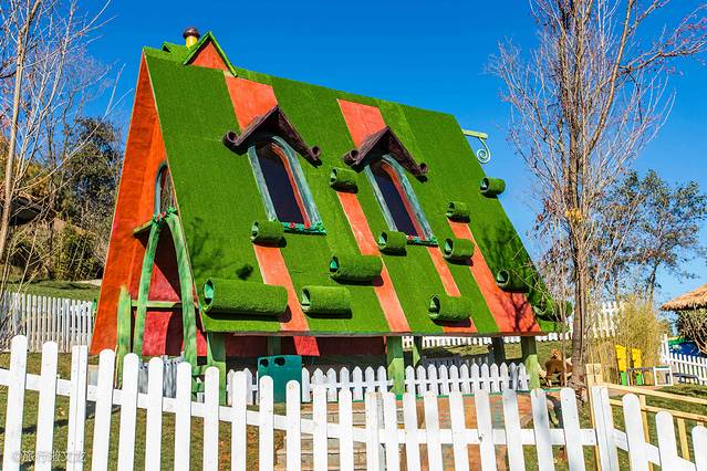 往前走紧接着,沿着前方的景区指示牌,我们又参观了“宠物市集”。沿路走过,一座造型奇特的小房子吸引着游客驻足拍照。驻足仔细一看,像是一个马棚的样子,不过造型更加卡通可爱这个房子主体是用木头搭建而成的,在房顶上铺着一排排绿色的毯子,下面是阴凉的棚子。