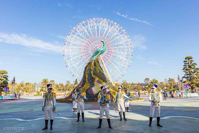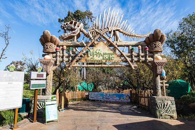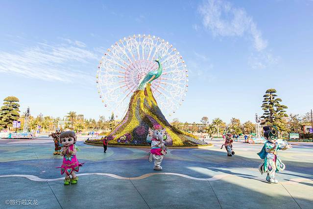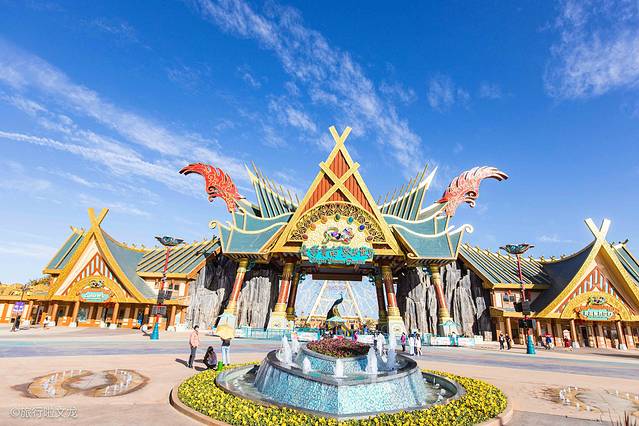 在一进入园区的大门口,就可以看到“七彩 云南 ·欢乐世界”的游乐园标语,而在标语旁的是独具 云南 特色的巨型孔雀雕塑,色彩艳丽,极具 云南 的民俗风情。而门口的建筑也很具有民俗特色, 云南 的吊脚楼建筑色彩搭配非常美观,很有观赏性。可以看出,园区将 云南 当地的民族特色都巧妙地融合在一起,给我们游客也宣传了 云南 的文化。