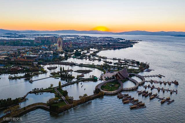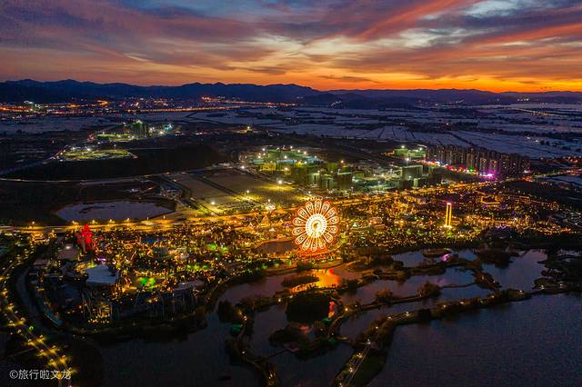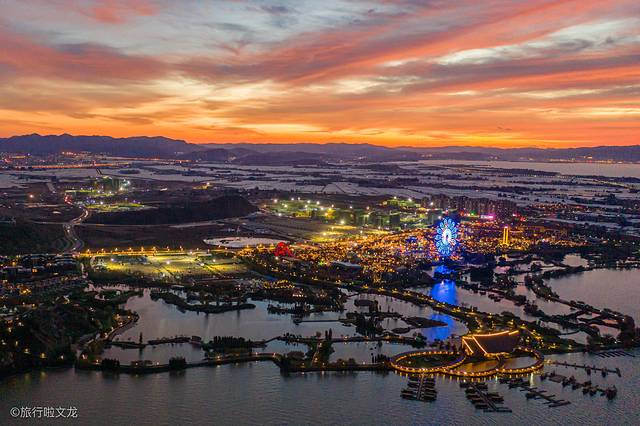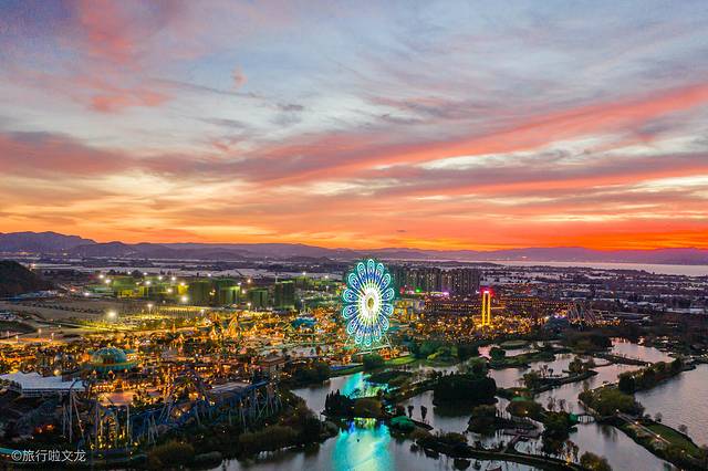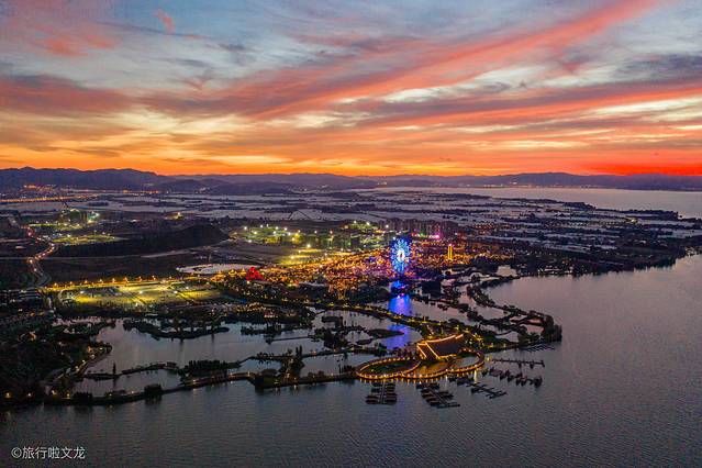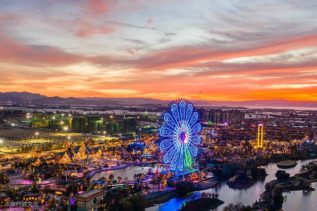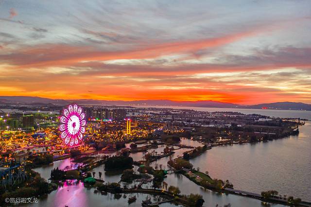七彩 云南 ·欢乐世界的摩天轮在傍晚更是大放光彩,更照耀了滇池的美,虽然风很大,我还强忍着担心,把无人机拉高,晚霞映着摩天轮连着滇池,一幅醉人的画卷。